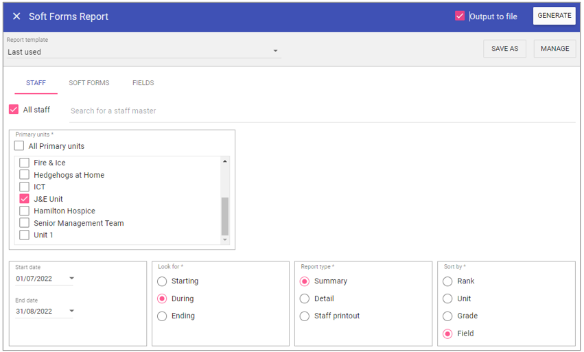 Fields: Choose which Fields within the Soft forms to report on.