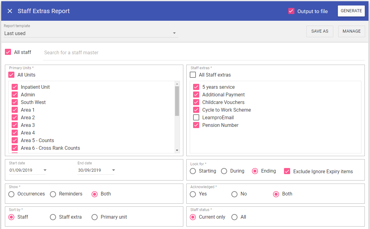 Staff extras: As with primary units, if this is selected the report will not filter by Extra type, however when unchecked individual Extras can be selected from the list allowing you to filter by the Extra type.