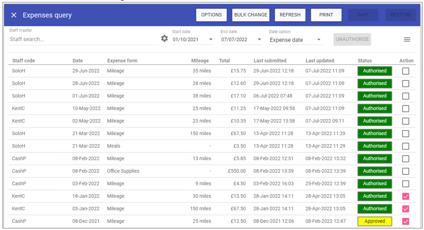 NOTE: You can only authorise approved expenses, if you select any expenses which are not authorised and click Bulk Change you will not be able to select Authorised: