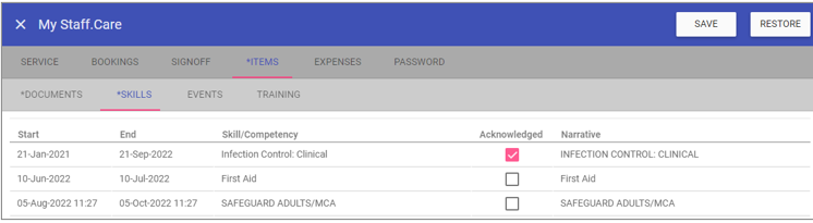 This screen allows you to view staff Skills that are created in Staff Maintenance > Skills. It is a viewer only, however, the ability to Acknowledge skills is possible via this screen.