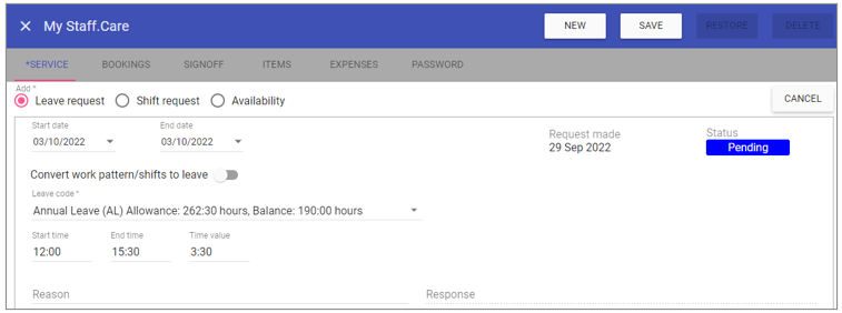 Availability to work (subject to permissions). The types of requests are listed below. To create a new request, click New, complete the relevant fields and click Save.