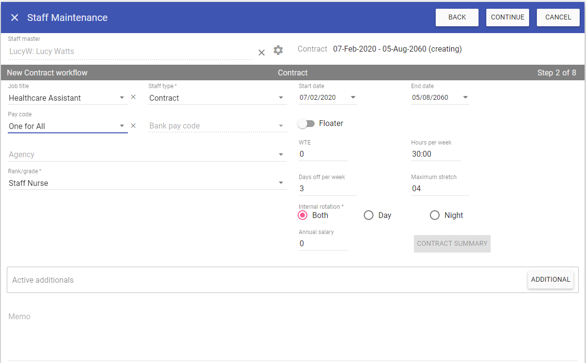 NOTE: If Work Patterns are selected whilst in this screen, the workflow changes from Step 7 of 9, to Step 7 to 10. Press Continue to complete the Work Patterns.