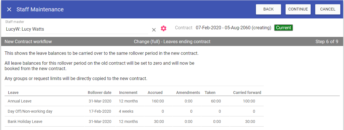 REMEMBER: You cannot complete a contract change retrospectively after you have completed the leave rollover.