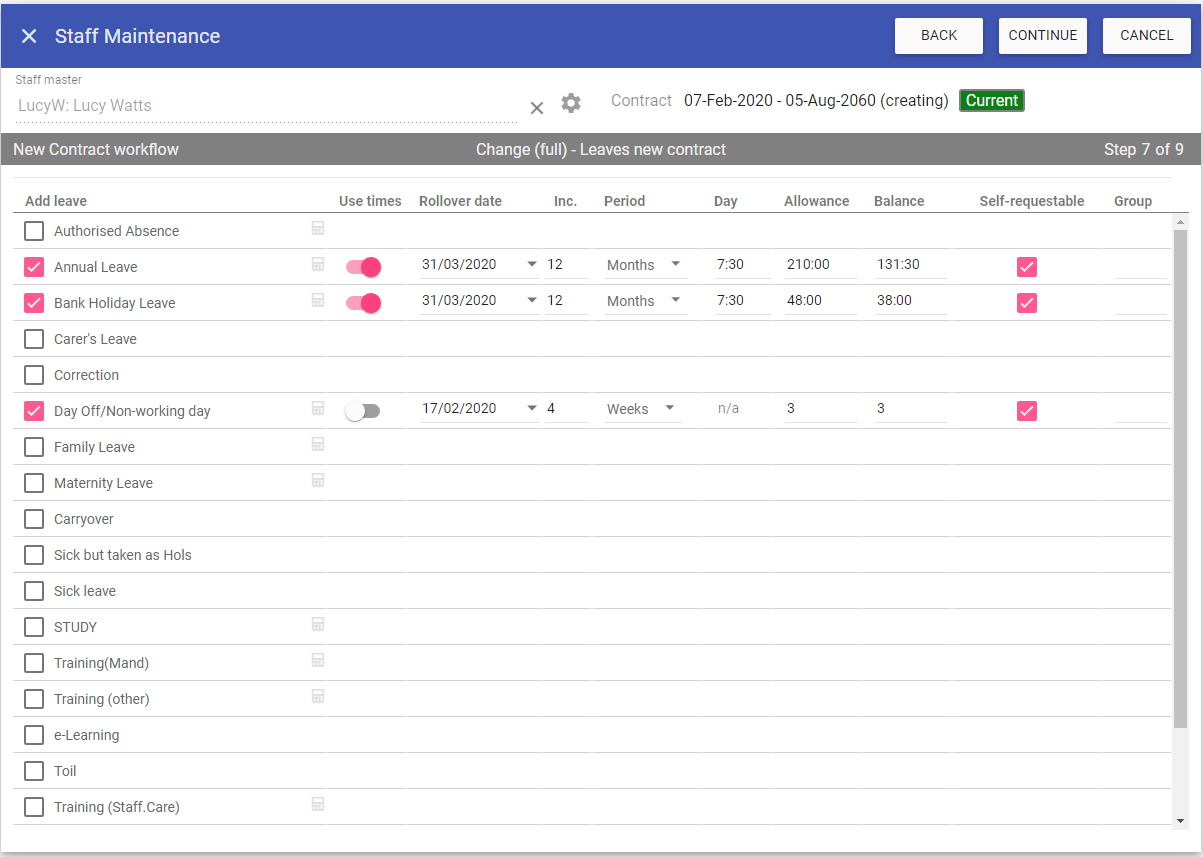 Clicking CONTINUE takes us to the new contract leaves screen.
