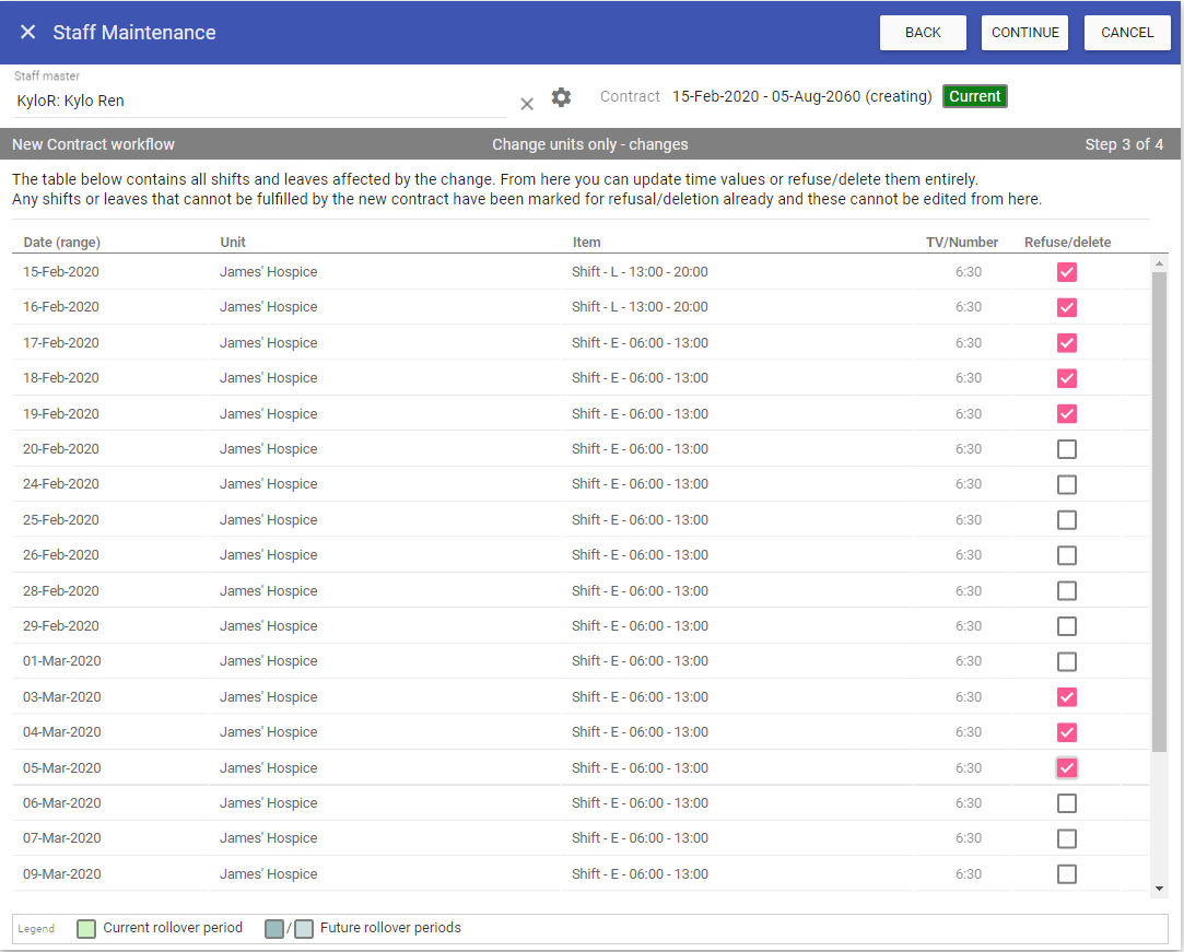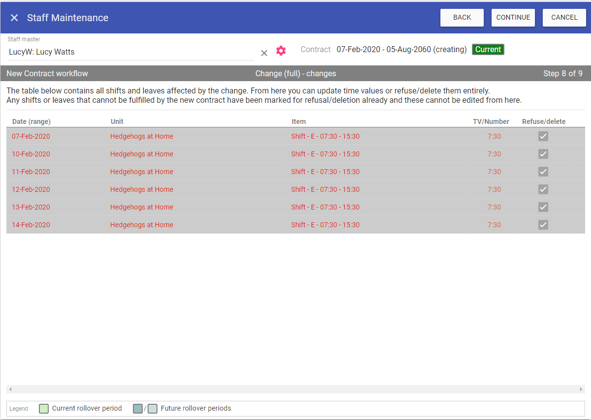 Any shifts that cannot be completed on the new contract will be deleted, you can also choose to refuse any leaves, change the leave time values or delete any other shifts as required.