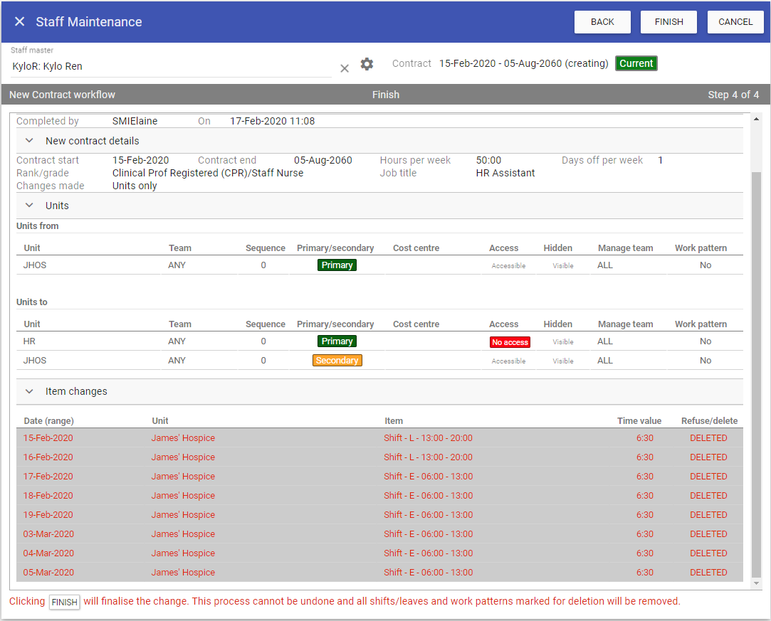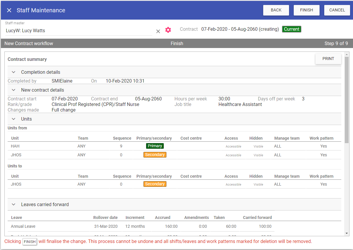Clicking FINISH will complete the workflow and save the new contract into Staff.Care. Any refused/deleted shifts/leaves will be removed.