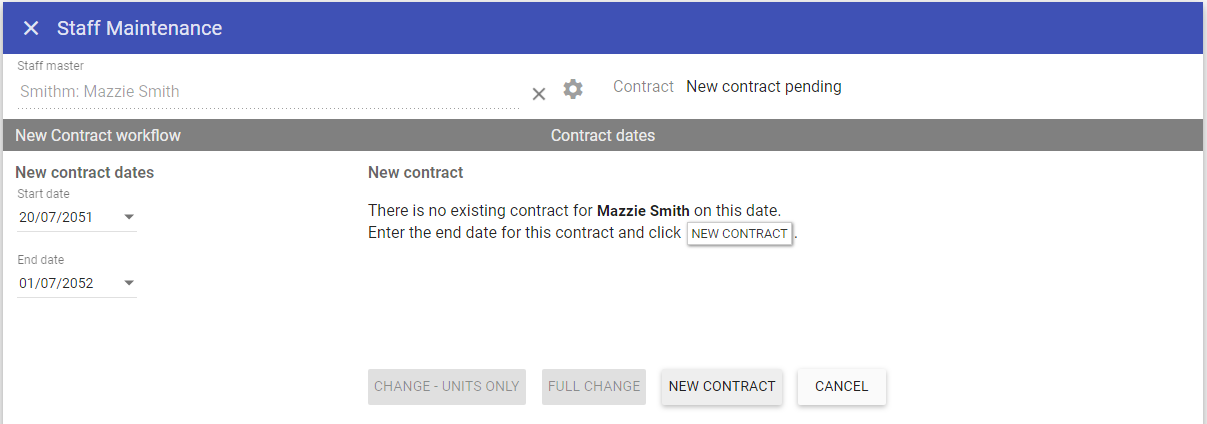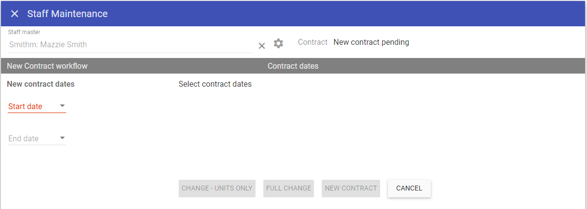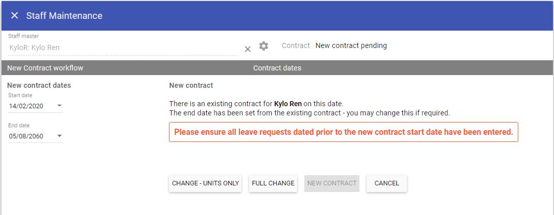 NOTE: If the staff member had previously left, the termination date and reason would be removed during this workflow.Upon entering a start date in the new contract workflow which overlaps a pre-existing contract you are prompted with the contract change dialogue and only have the option to either complete a units only or a full change.