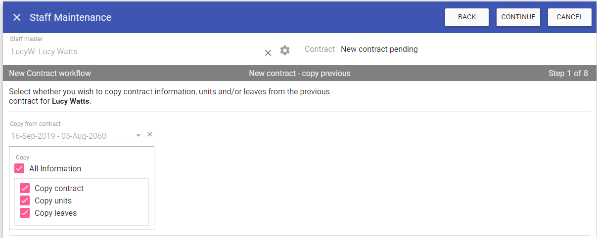 In the next screen you can choose whether or not to copy details from an old contract by selecting the contract from the dropdown, and choosing which information to copy.