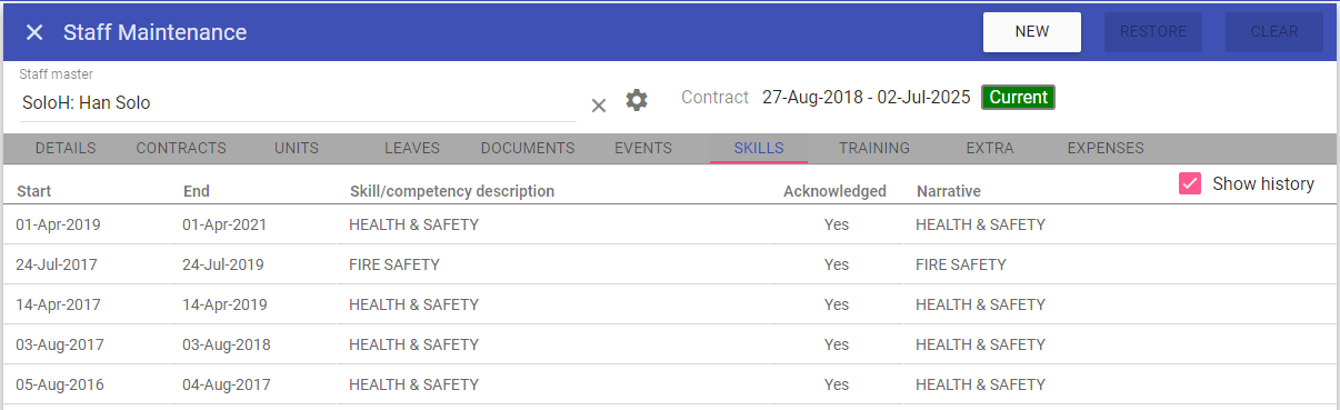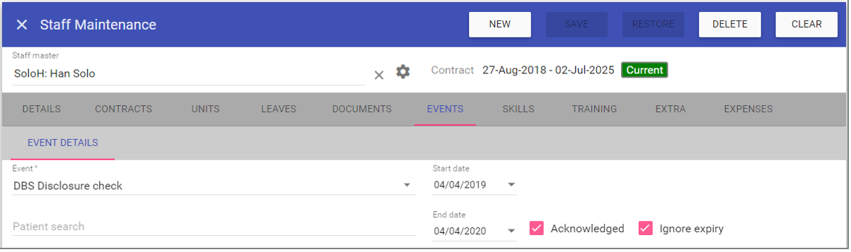 This screen is for staff member details including adding new users to the system and assigning their contracts, units, leaves, events, skills, training and expenses.
