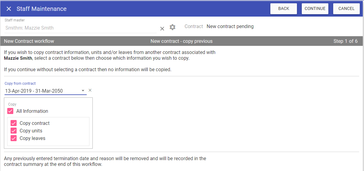NOTE: You can choose not to copy certain information across, however, SMI recommend you copy everything forward unless the staff member is moving from contract to bank or bank to contract.