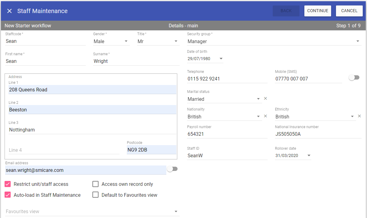 Upon clicking finish the new starter is added to Staff.Care and you are taken to the main Staff Maintenance screen ready to add the next one.
