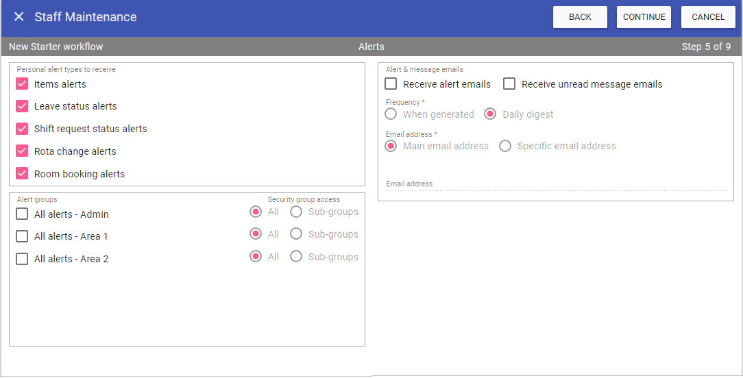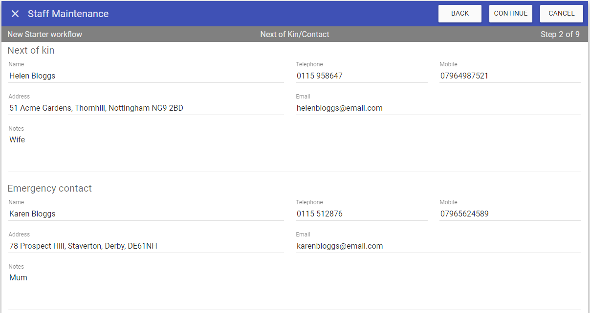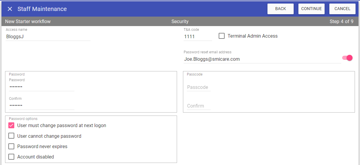 The new starter workflow is a 9 step process. During the workflow you can go back to previous steps by clicking BACK and move forward by clicking CONTINUE.