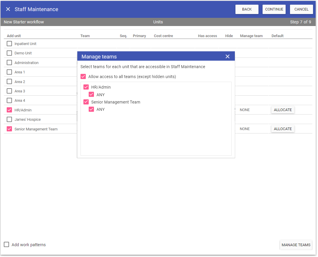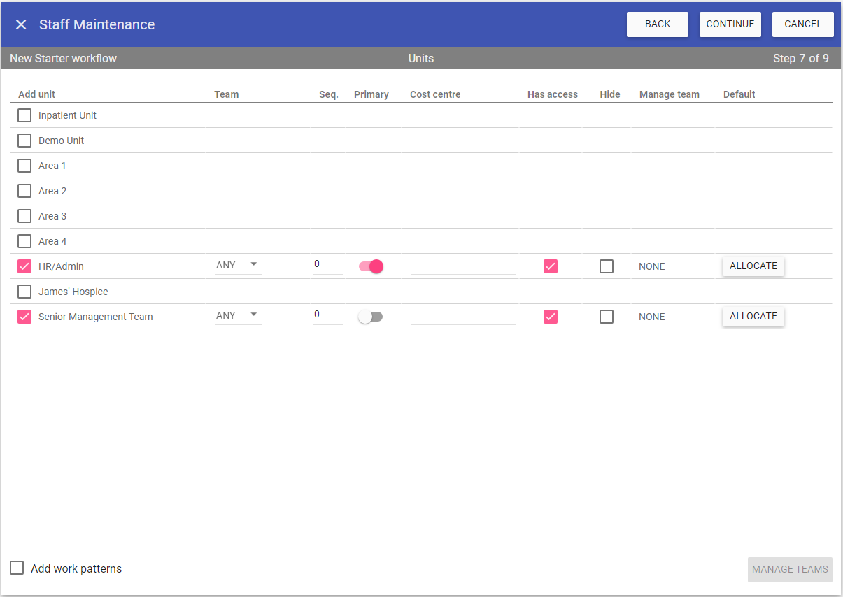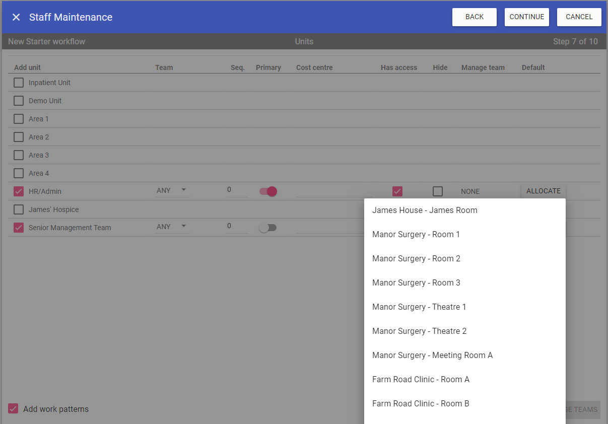 Step 7 is assigning the Staff member to Units, Work Patterns, Manage Teams and Default Rooms.
