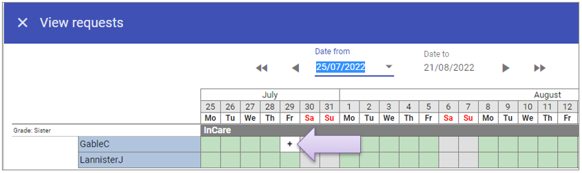 This screen allows you view Staff Requests (both shift & leave) in a rota view and allows you to manage these requests by providing a response to the request. E.g. To approve or decline the request. You can also setup the limit in hours per week for each of the groups setup in Unit > Maintenance > Request Limits.