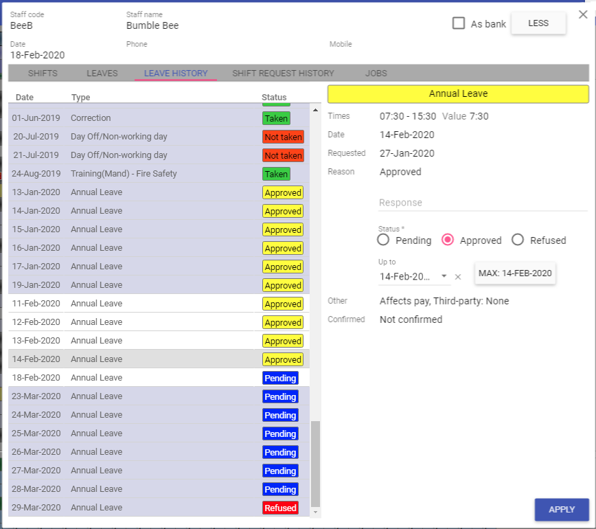 Shifts and Leaves can then be assigned against the selected staff member. Time balances will then be automatically adjusted.