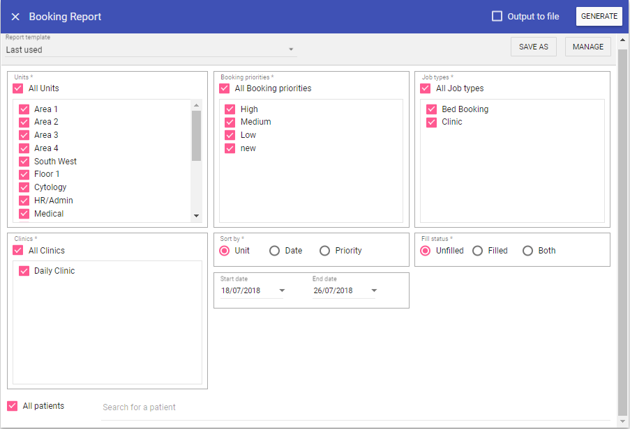 Clinics: Select the required clinics to be reported on.