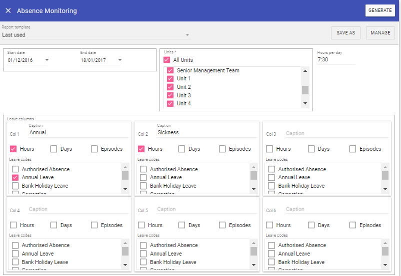 The Absence Monitoring Report is dependent on Establishment values being entered in Unit Maintenance.