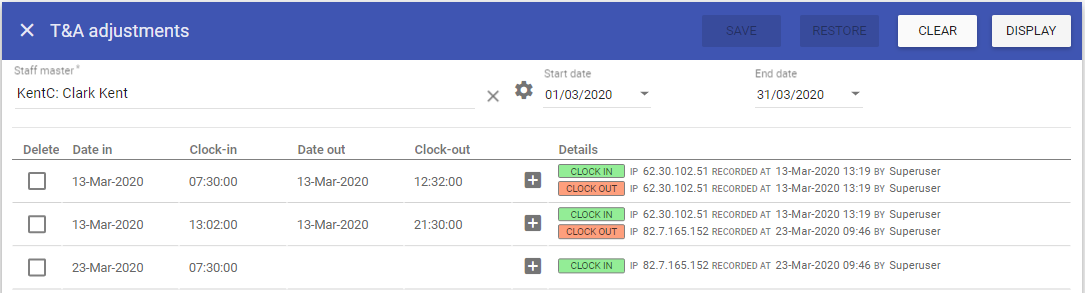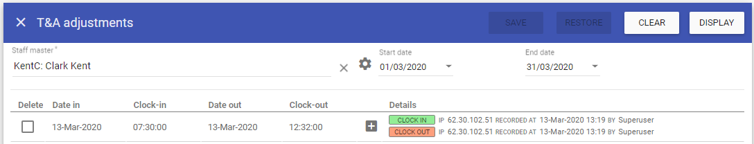The T&A Adjustments sections allows for the editing of recorded Time and Attendance information should changes be required and creation of clock in’s and out’s.