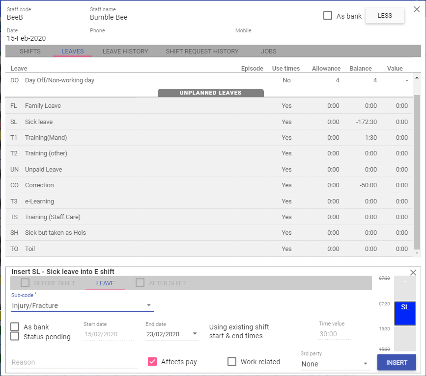 You can now change the end date to insert multiple days of leave that will mirror the time values of the shifts on the rota, add a sub-code for the SL