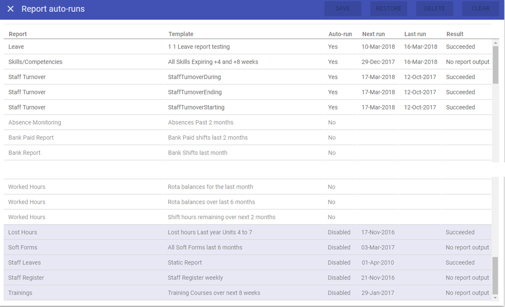 Auto-runs are sorted showing active auto-runs at the top, followed by templates (light grey text) not yet set to auto-run and at the bottom those that have been disabled (grey