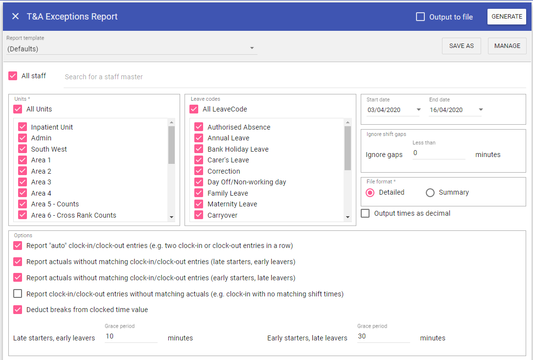 Report actuals without matching clock-in/clock-out entries (early starters, late leavers): Reports on clock-in/out entries that fall out the shift start time by the grace period i.e. early starters/late leavers.