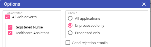 Send rejection emails: Automatically send an email to the applicant that their application has been successful. The reject template is setup in Admin >