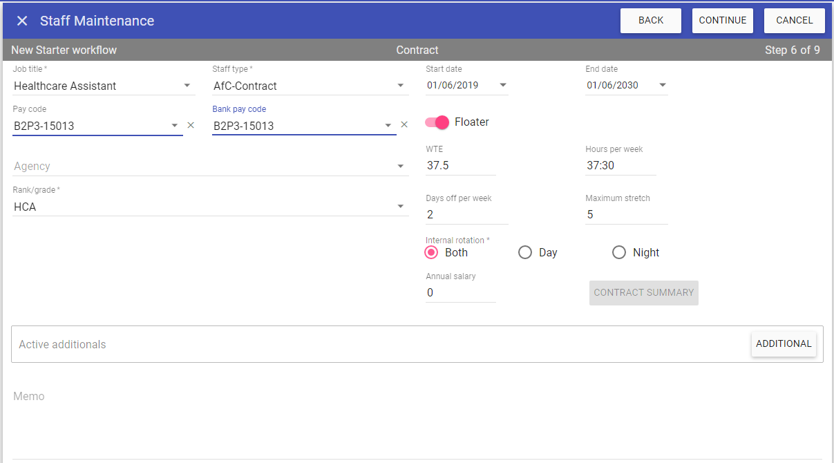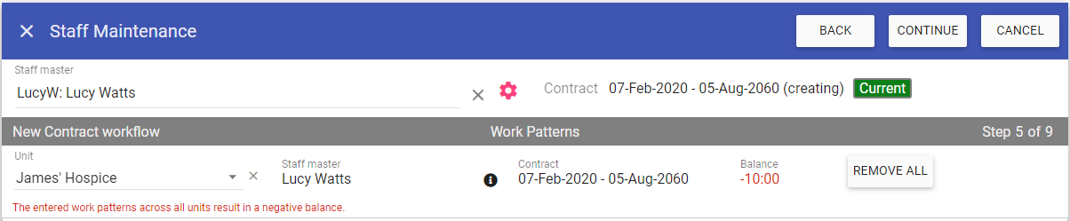 NOTE: If Work Patterns are selected whilst in this screen, the workflow changes from Step 7 of 9, to Step 7 to 10. Press Continue to complete the Work Patterns.