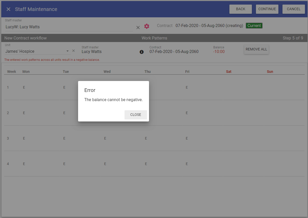 Once you have updated the working pattern so the balance is 0:00 or above, you can continue.
