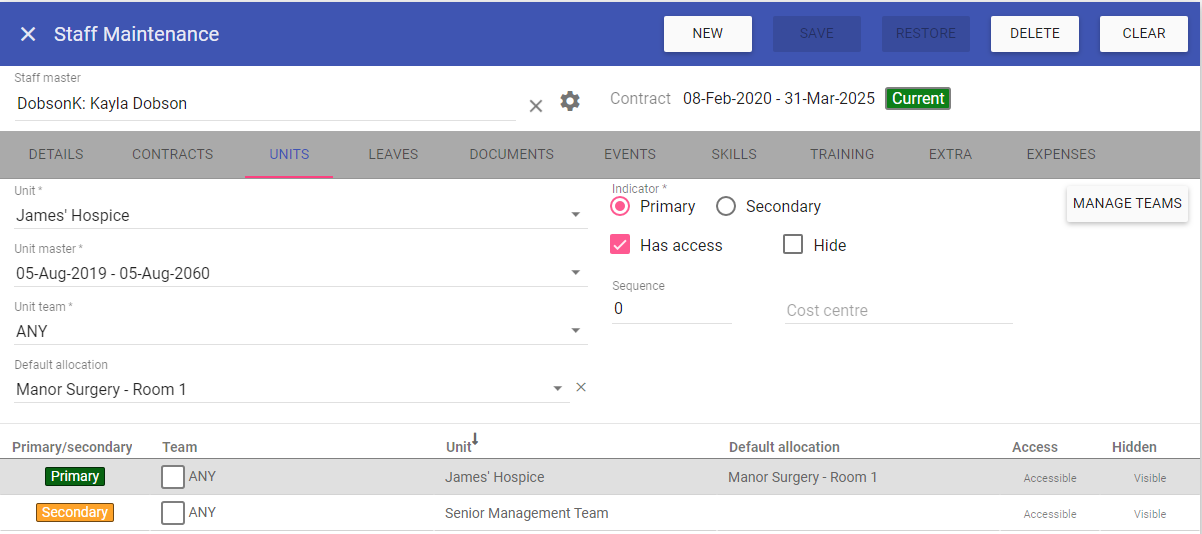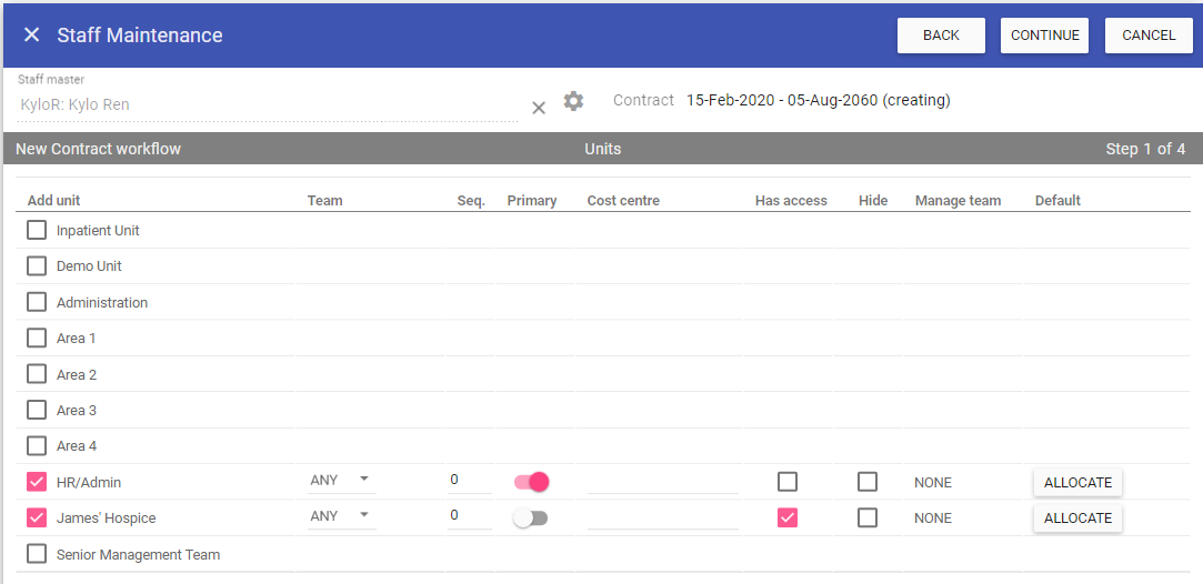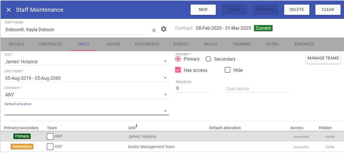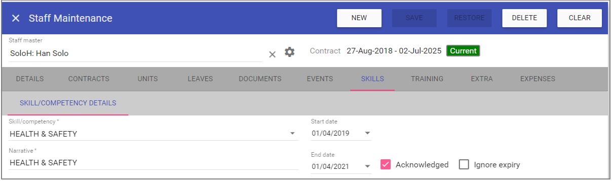 This screen is for staff member details including adding new users to the system and assigning their contracts, units, leaves, events, skills, training and expenses.