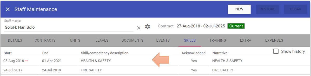 Selecting Show history within the list will show all entries individually, with the latest end date at the top: