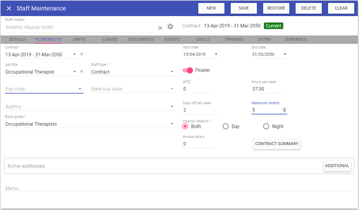 In order to add a new contract to a staff member, simply open their staff maintenance record, navigate to the Contracts tab and click New