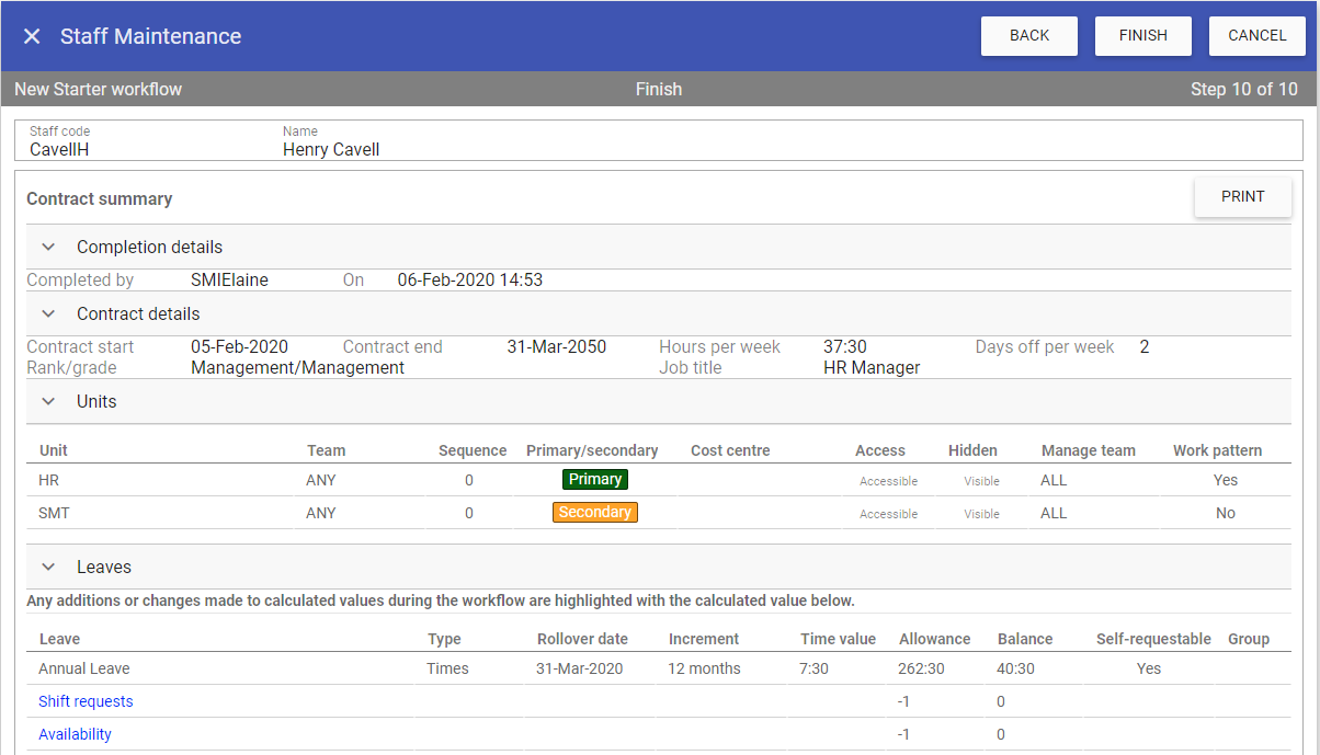 Clicking FINISH will complete the workflow and save the new contract into Staff.Care. Any refused/deleted shifts/leaves will be removed.