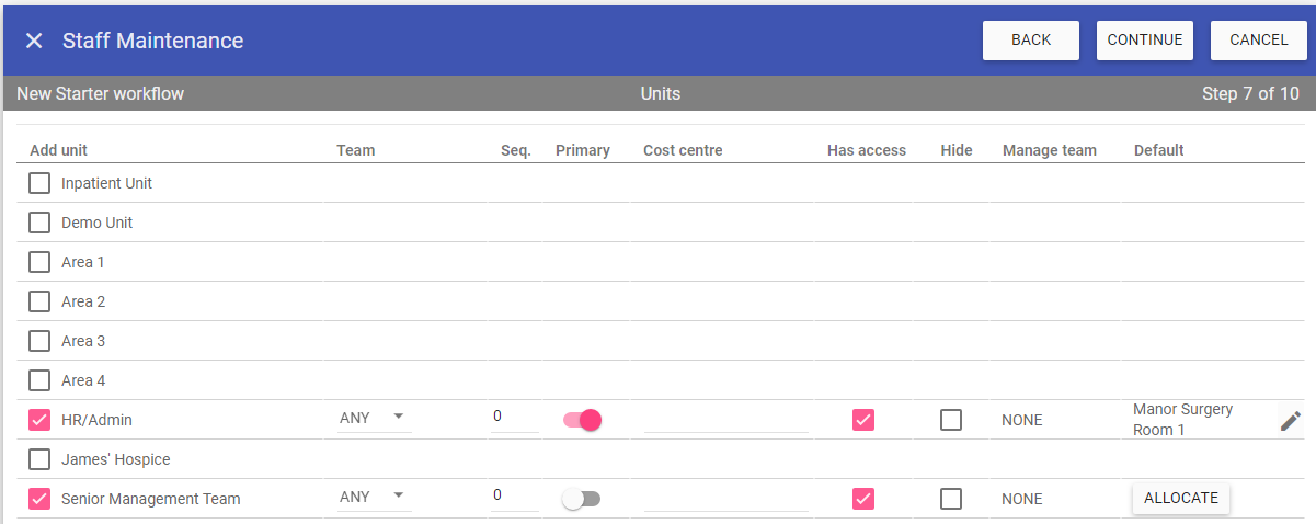 If you don't add a default room to a staff member during any of the contract workflows, you can do this retrospectively by clicking on the unit under the Units tab