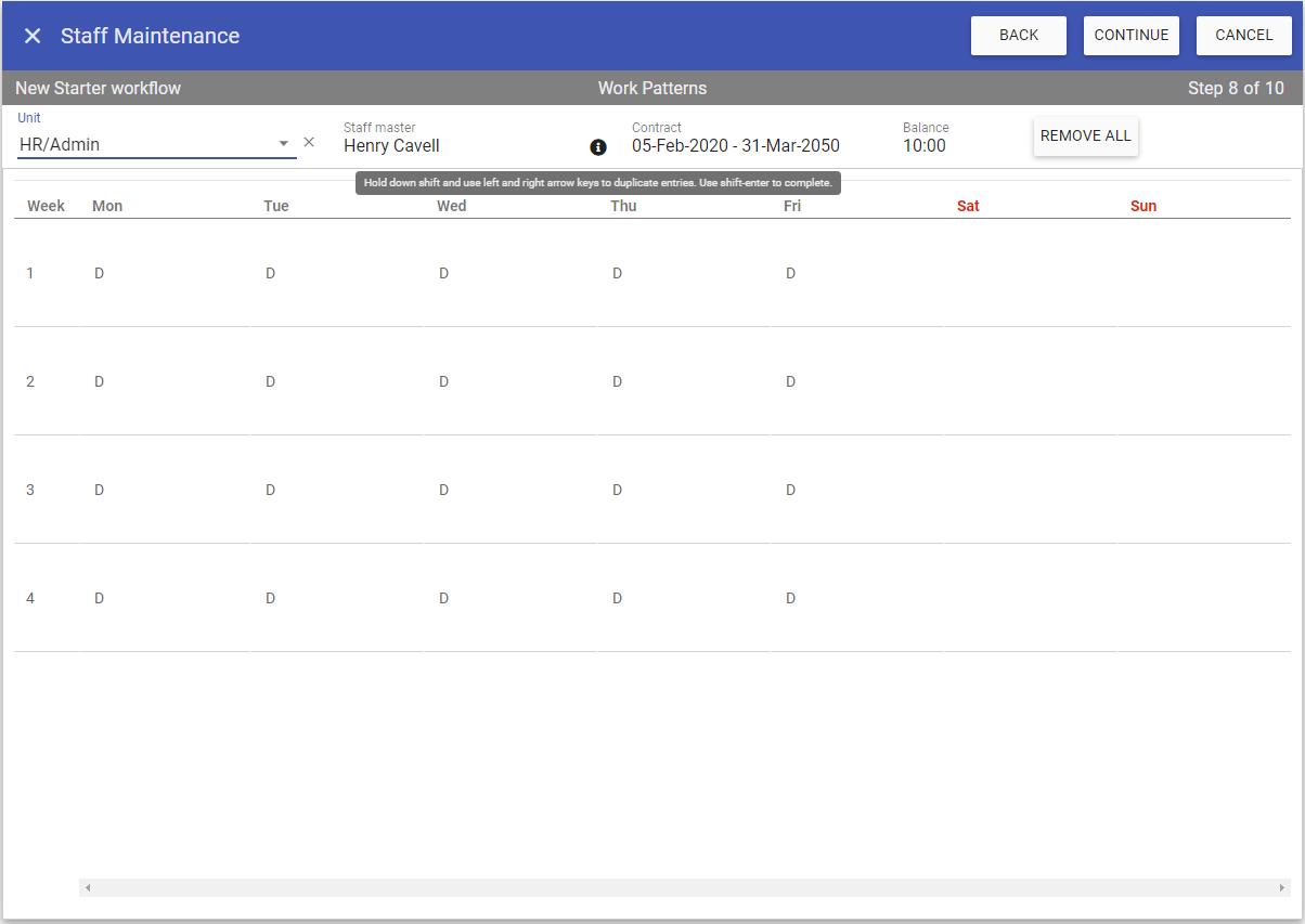 On this screen you can add a working pattern for the shifts the staff member will do: