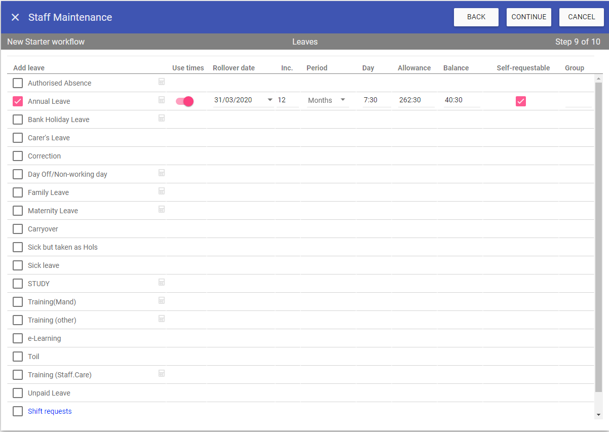 Step 9 is associating staff leaves, this screen is in the same format as the units. Simply ticking a leave will add it to the staff member’s record.