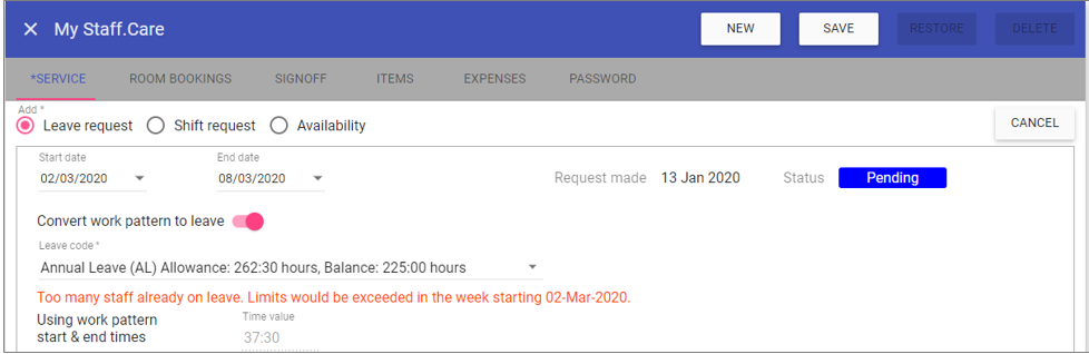 When staff are requesting leave, they will need to be aware of a new warning message, "Too many staff already on leave. Limits would be exceeded in the week