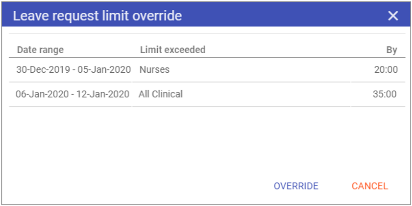 If you are adding leave via the rota and at least one request limit will be exceeded in doing so, you will be presented with the following warning and the ability to