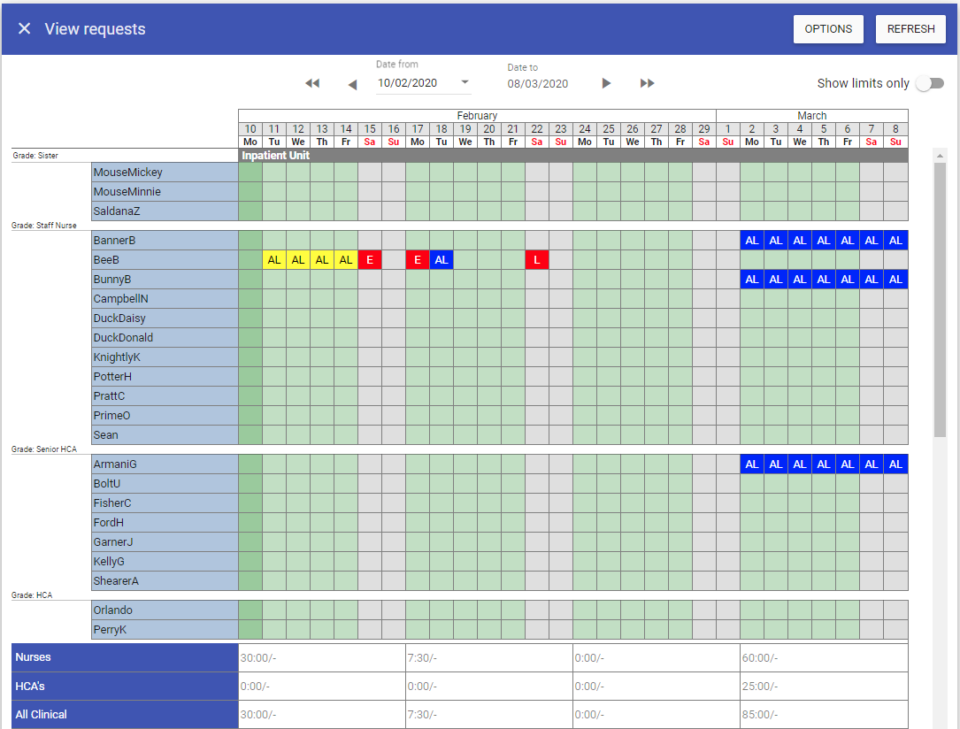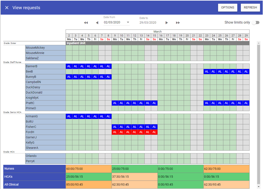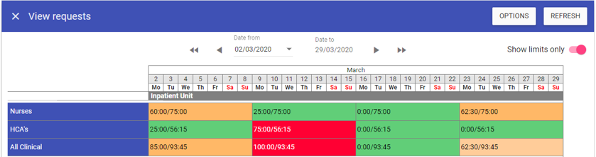 With the limits set, we are allowing 75 hours per week of Nursing annual leave and 75 hours per week of HCA annual leave but we are only allowing a total of 112:30 of both