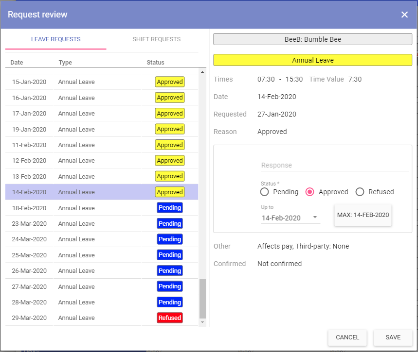 This screen allows you view Staff Requests (both shift & leave) in a rota view and allows you to manage these requests by providing a