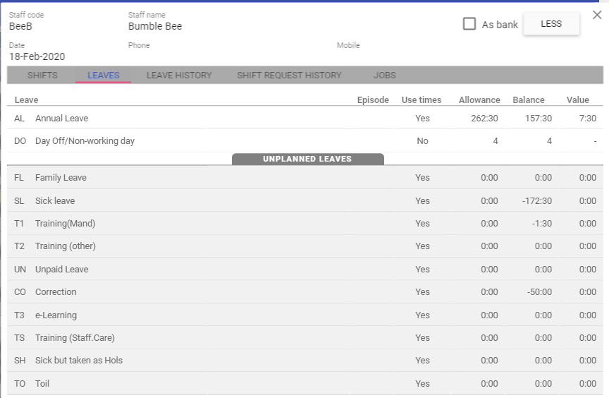 Select the Leave tab on the Shift/Leaves window - all planned and unplanned leave (has no time allowance) displays on the same screen.