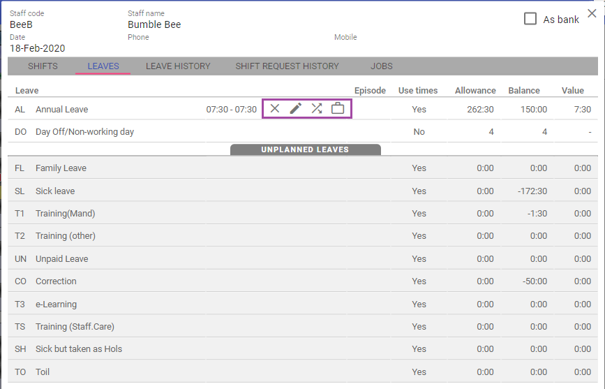Click back onto the leave just added, and the following icons are available: