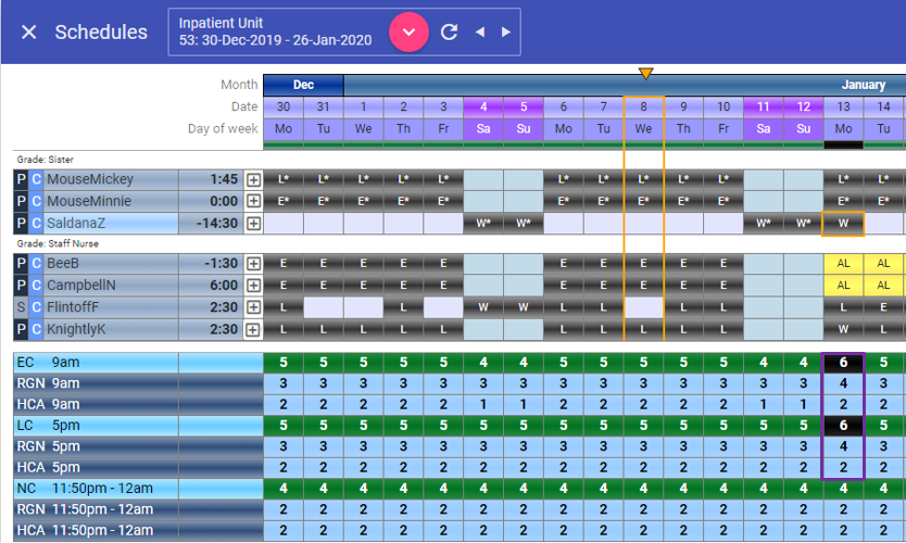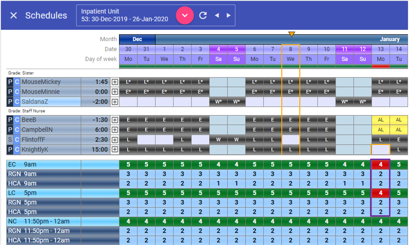 In the example below, the rota is under in both the E and L shift on the 13th January: