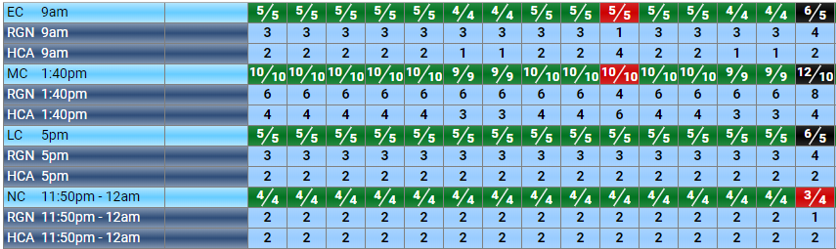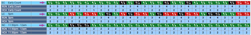 every shift that crosses each main code time is counted. The shifts are at the top and the needs totals are underneath: