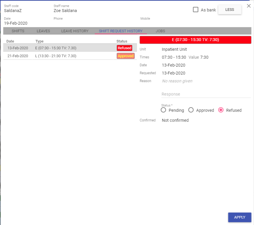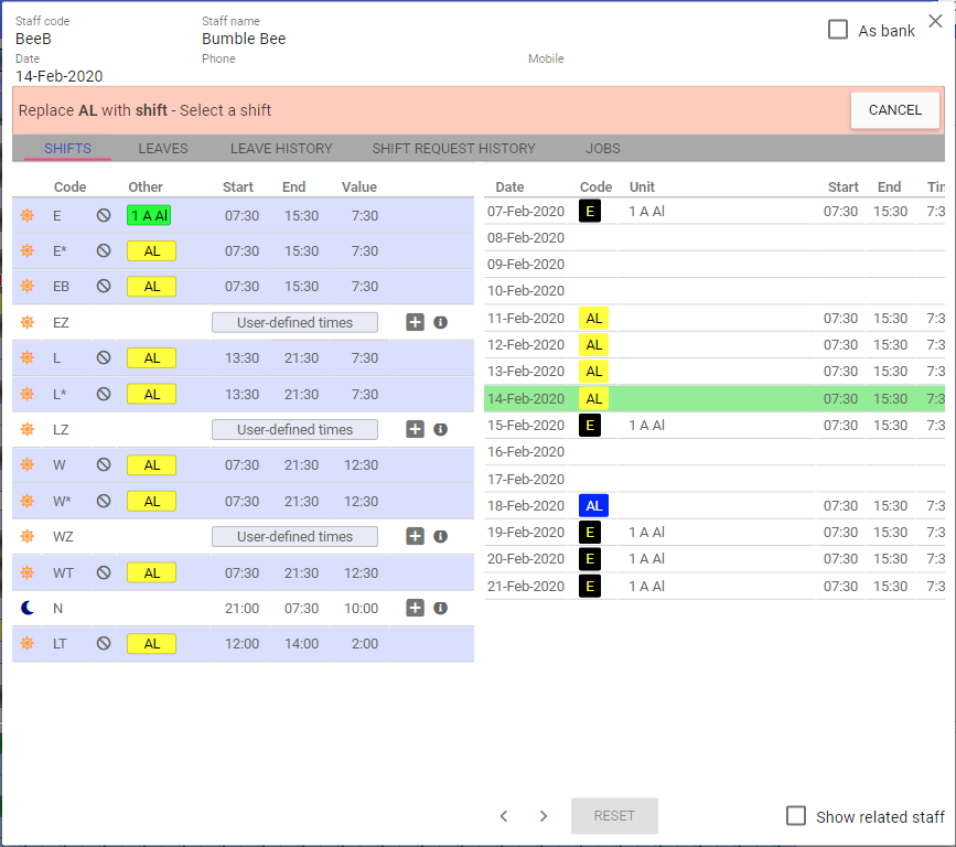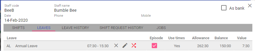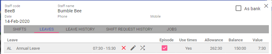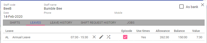 Shifts and Leaves can then be assigned against the selected staff member. Time balances will then be automatically adjusted.