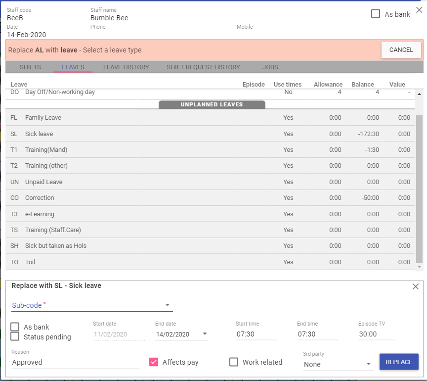 NOTE: You can only swap a single day of leave to a shift, if you select a whole episode