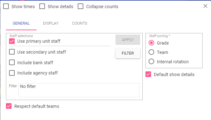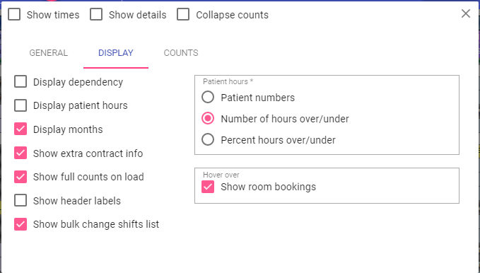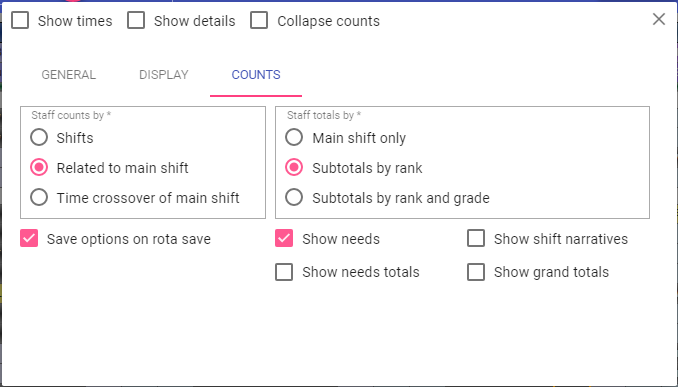 Save options on rota save: Save the count selections made when the rota is saved. When re-opened the settings are retained.
