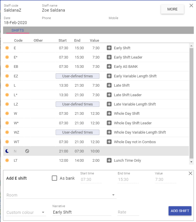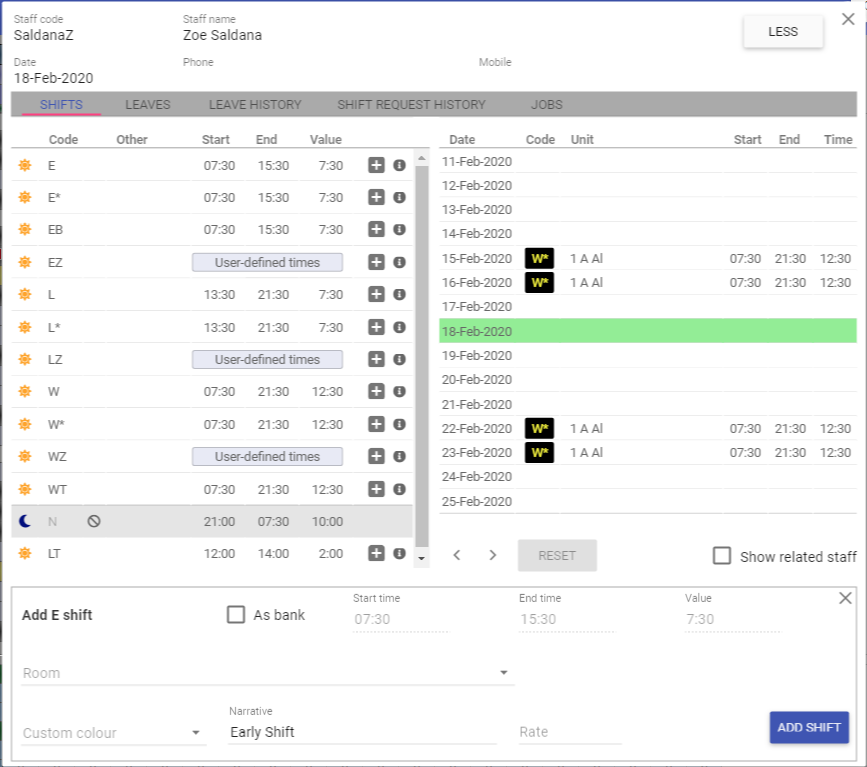 In both images above the Show shift narratives option is on, hence the shift times are displayed alongside the shift code.