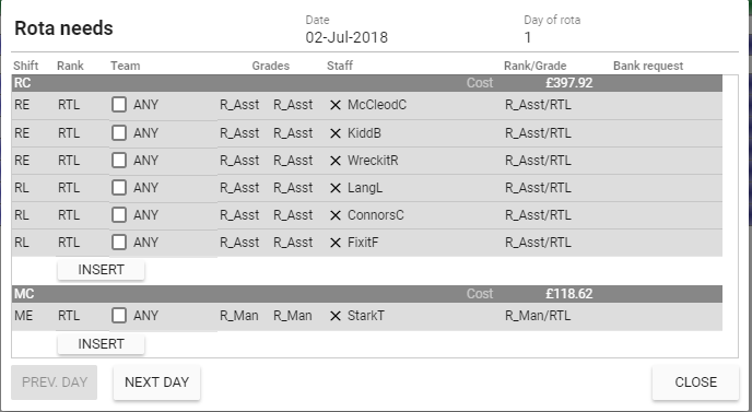 This page is opened by selecting the cell adjacent to the staff code and for the required DATE and DAY. Click once in the cell.