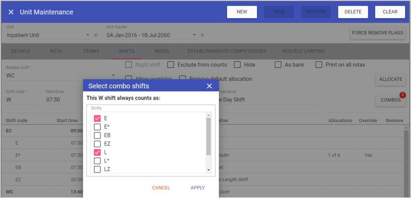 Clicking on the Combos button will allow you to set up combos to include 2 shifts (Early and Late) which can be amalgamated to create one long shift i.e. W shift: