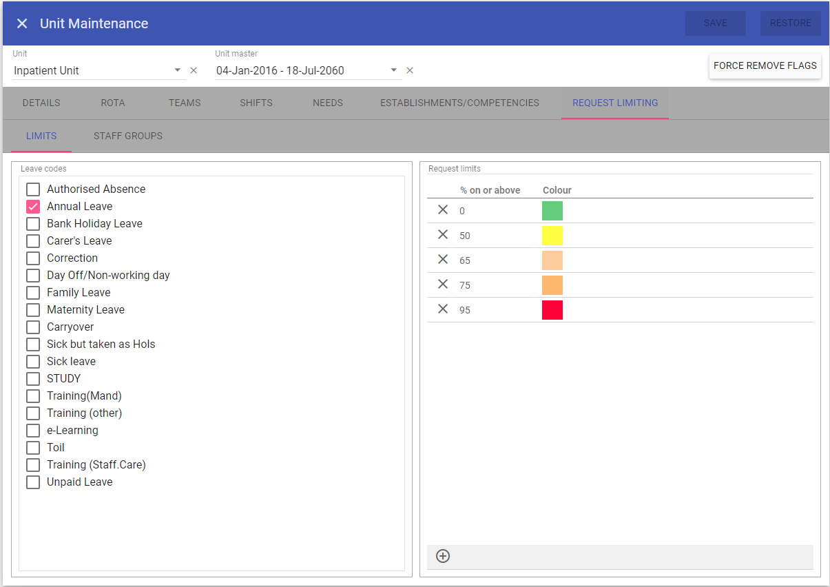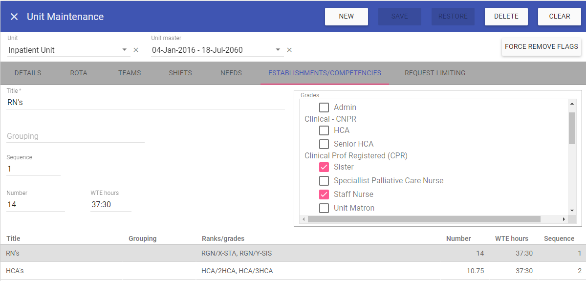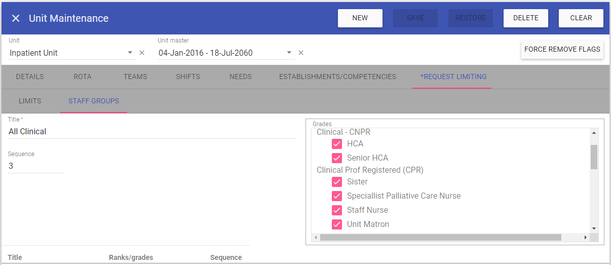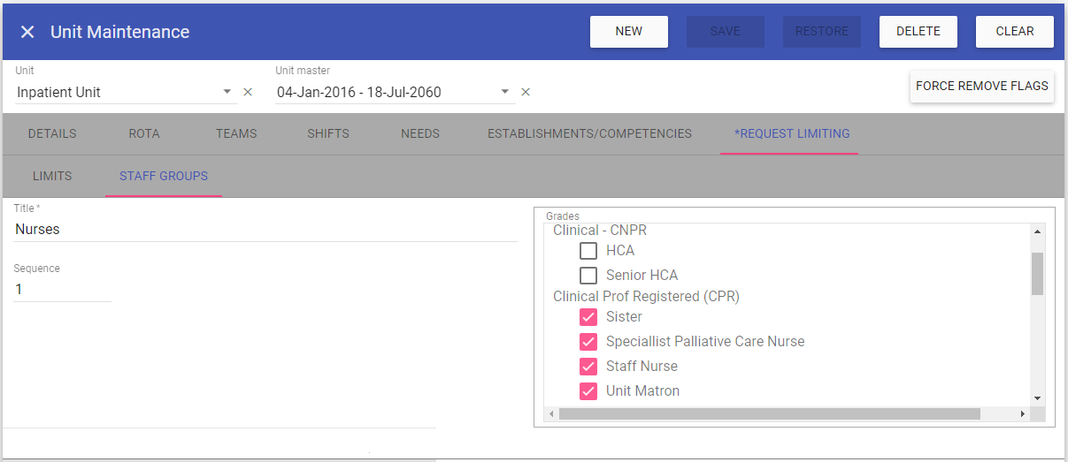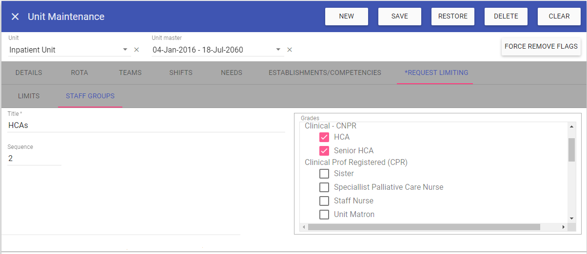 In the example below we have setup a group limit for nurses (including all nursing grades), a group limit for HCAs (including all HCA grades) and another limit for All Clinical Staff